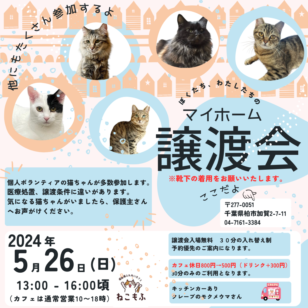 保護猫カフェ在籍の里親募集中の猫さん&個人ボランティアも多数の保護猫さんを連れ参加予定。
