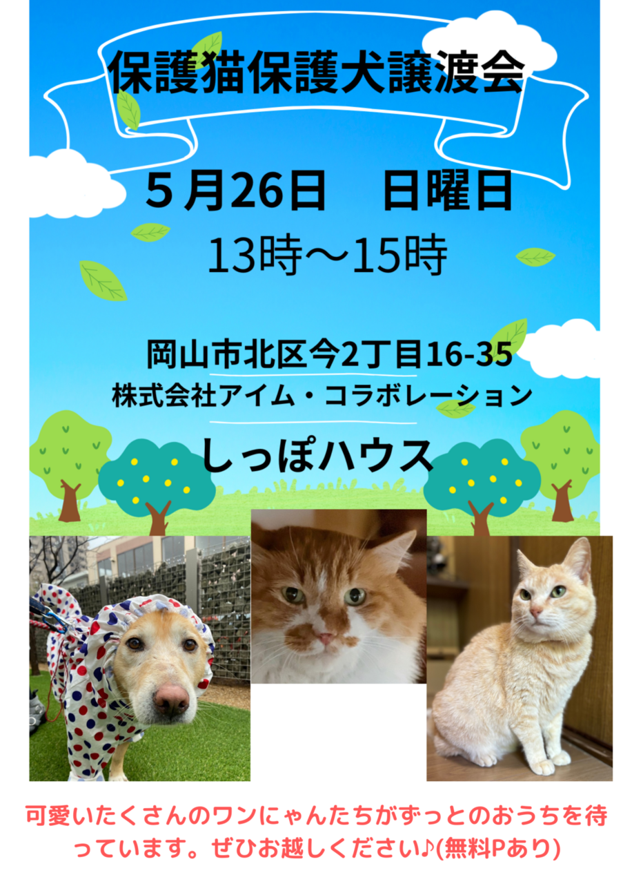 9月30日日曜日13時~15時もふもふいっぱい保護猫保護犬譲渡会をいたします!!場所…株式会社アイム・コラボレーション別館しっぽハウス〒700-0975岡...