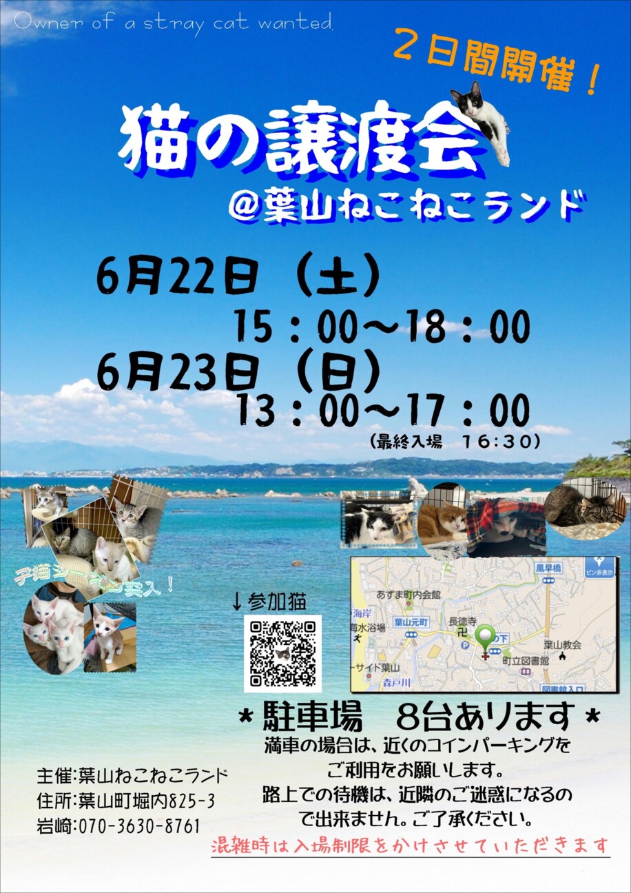 2025年1月26日(日)13〜17時神奈川県三浦郡葉山町堀内825-31F奥葉山ねこねこランドお問合せ岩崎日登美07036308761(譲渡会当日は電話...