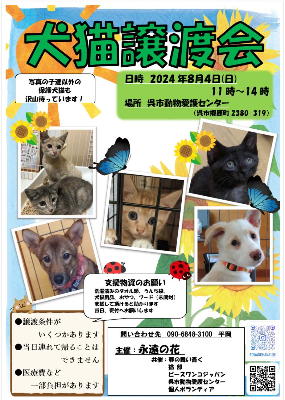 いくつかの団体さんが来られるので、ポスターに載っている子達以外にも沢山の成犬・子犬・成猫・子猫が参加します。ぜひ足を運んでください!雨天決行、駐車場もあり...