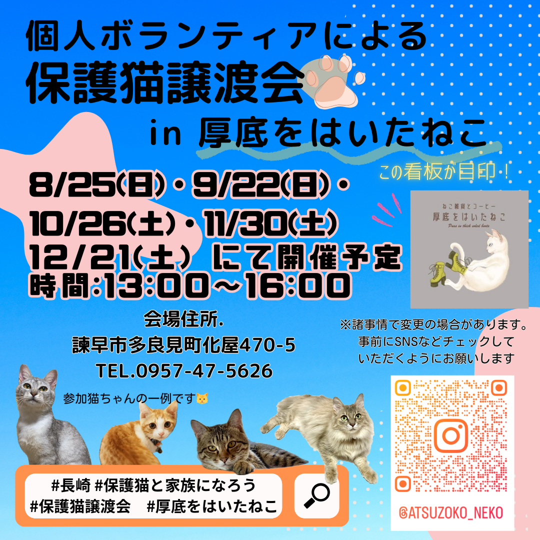 ✰⋆。・*☽:゚譲渡会のお知らせ。✰⋆。:゚・*☽日時2026.4.25会場諫早市多良見町化屋470-5厚底をはいたねこさん店舗内インスタアカウント@at...