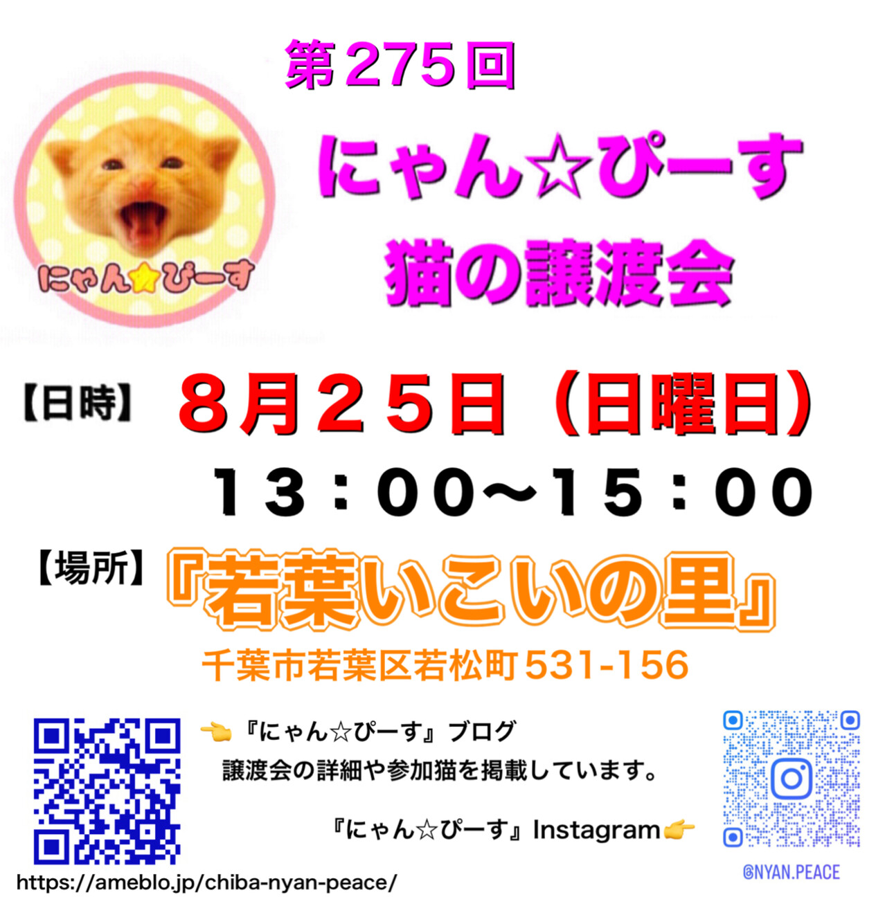 にゃん☆ぴーす猫の譲渡会【若葉いこいの里】千葉市若葉区若松町(みつわ台総合病院近く)