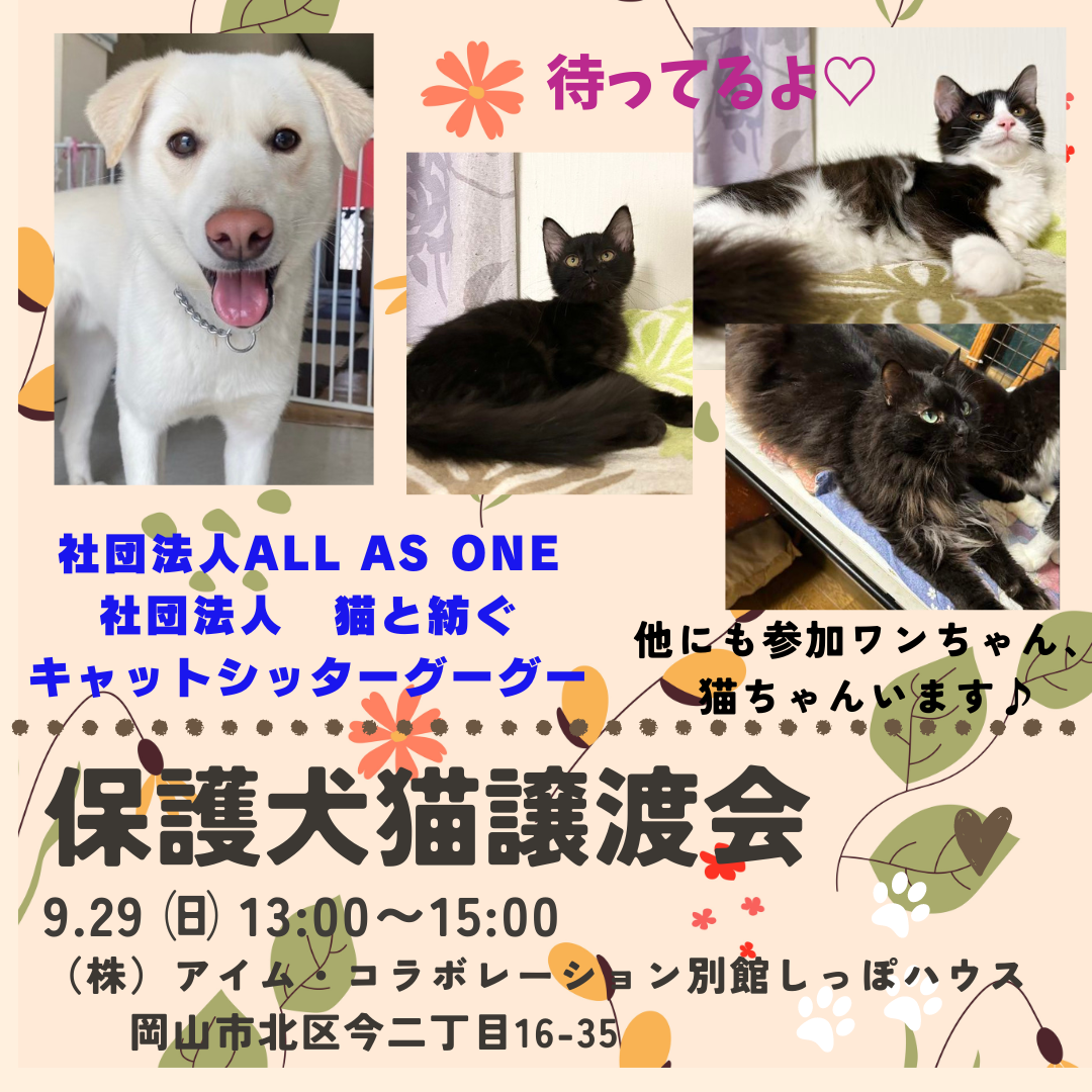 10月1日日曜日(株)アイムコラボレーション内「しっぽハウス」にて保護猫譲渡会を初開催いたします!!2か月から1歳の総勢10匹の可愛い猫たちが参加します。...