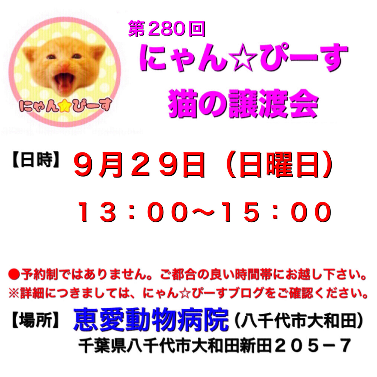 にゃん☆ぴーす猫の譲渡会【八千代/恵愛動物病院】