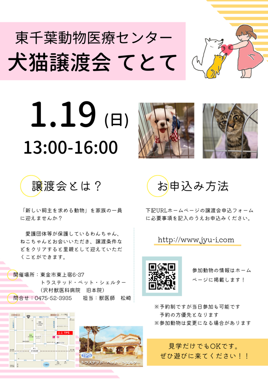 動物病院主宰の譲渡会です。予約制ですが、当日参加もOKです。ぜひ遊びに来てください!!