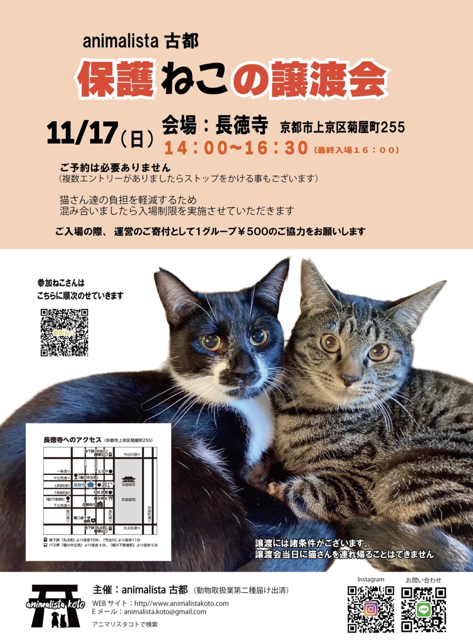猫の譲渡会を開催しております今回は1〜2才の若い大人猫さんを中心に子猫も少しだけ参加します会場内が密になる事を避け猫さん達の負担を軽減するため人が多い時は...
