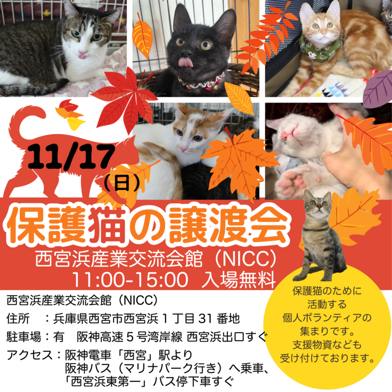 西宮保護ねこかぎしっぽ主催の譲渡会のお知らせです。日時:4/19(日)場所:西宮浜産業交流会館(NICC)時間:11:00〜15:00ご予約は不要ですが、...