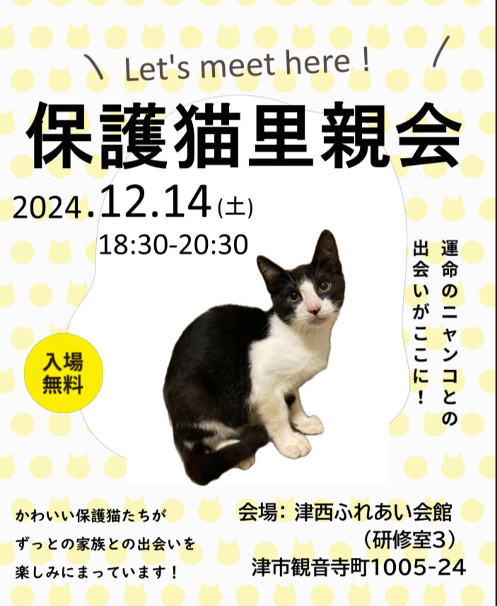 三重県津市で保護猫活動をしている個人ボランティアです。 保護猫たちのずっとの家族を探すために、里親会を開催することにしました。 日時: 2024年12月14日(土) 18:30-20:30 場所: 津西ふれあい会館 三重県津市観音寺町1005番24 是非かわいい猫たちに会いに来てください