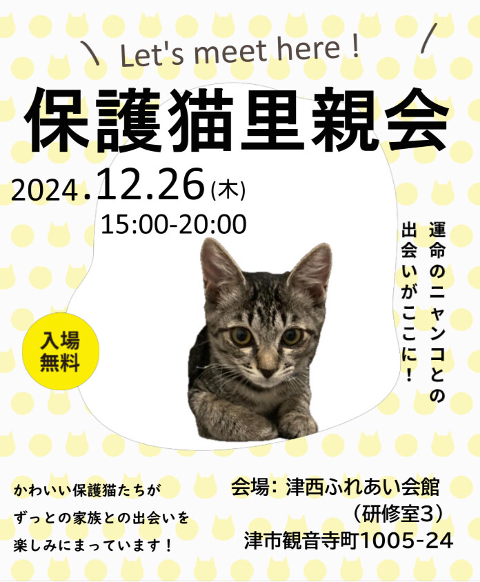 三重県津市で保護猫活動をしている個人ボランティアです。 保護猫たちのずっとの家族を探すために、里親会を開催することにしました。 日時: 2024年12月26日(木) 15:00-20:00 場所: 津西ふれあい会館 三重県津市観音寺町1005番24 是非かわいい猫たちに会いに来てください