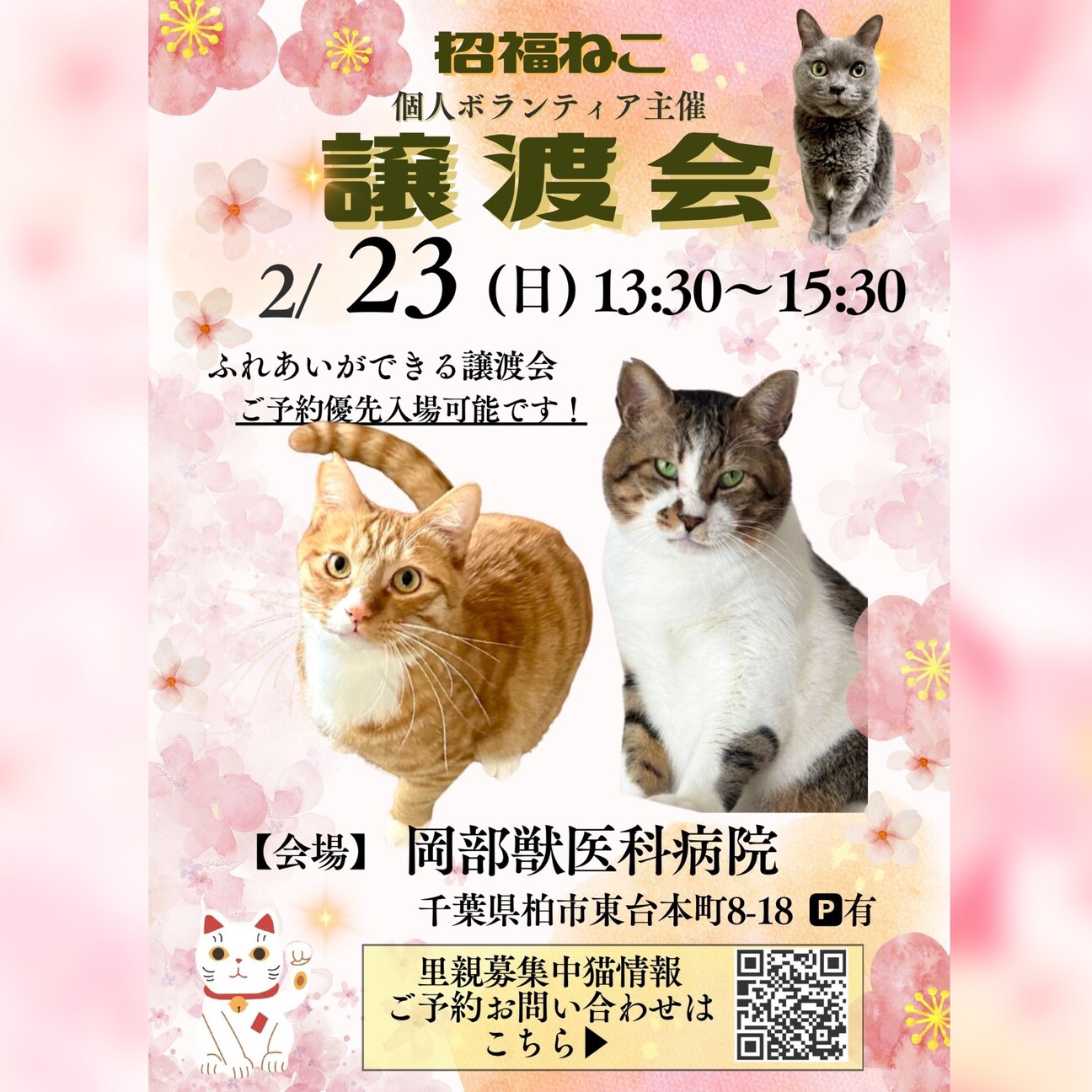 招福ねこ譲渡会:個人ボラが集い開催!7/13(日)13:30〜15:30(最終入場15:15)場所:岡部獣医科病院P有千葉県柏市東台本町8-18駐車スペー...