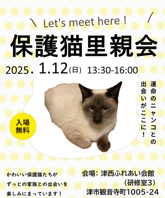 保護猫里親会in津西ふれあい会館 2025年初めての里親会は1月5日(日)に開催いたします 日時: 2025年1月12日(日) 13:30-16:00 場所: 津西ふれあい会館 三重県津市観音寺町1005-24