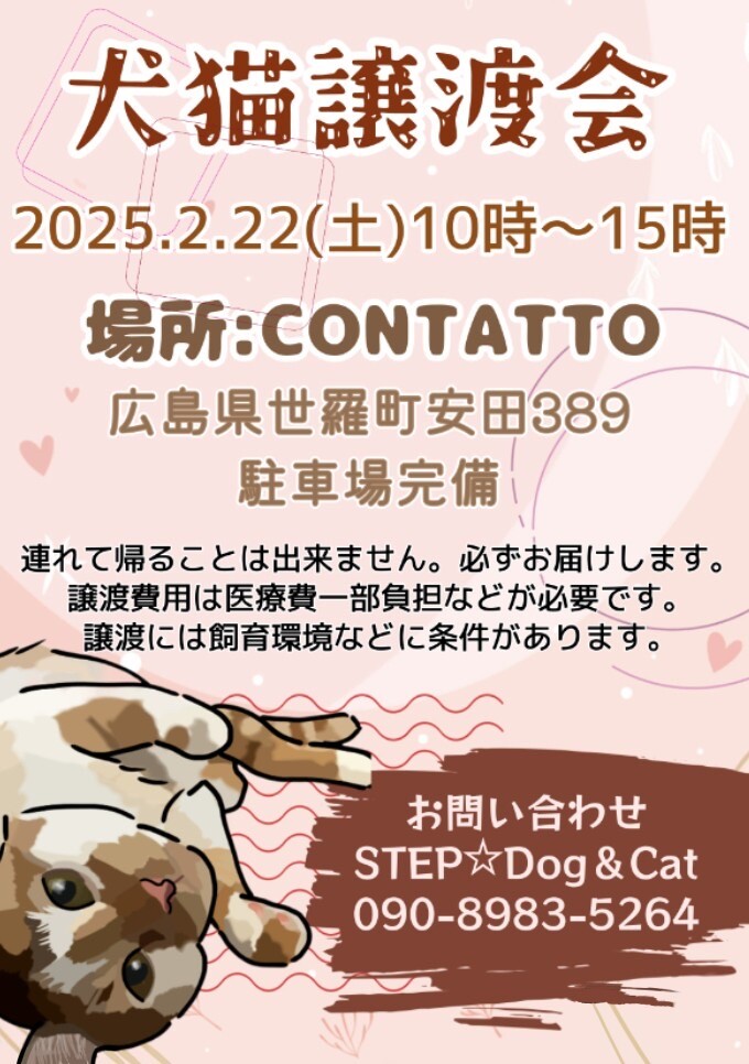 世羅町のドッグカフェandランのcontattoさんにて開催の犬猫譲渡会です!暖かい室内開催で駐車場もバッチリ