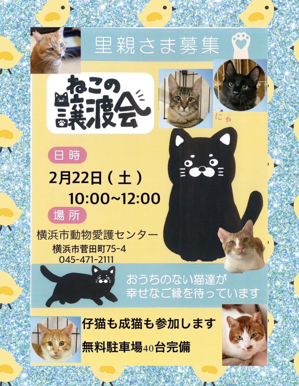 個人ボランティア数人で開催しています仔猫から成猫まで参加予定(当日の体調などで変化あり)予約不要無料駐車場多数あり当日連れて帰る事はできません譲渡には条件...