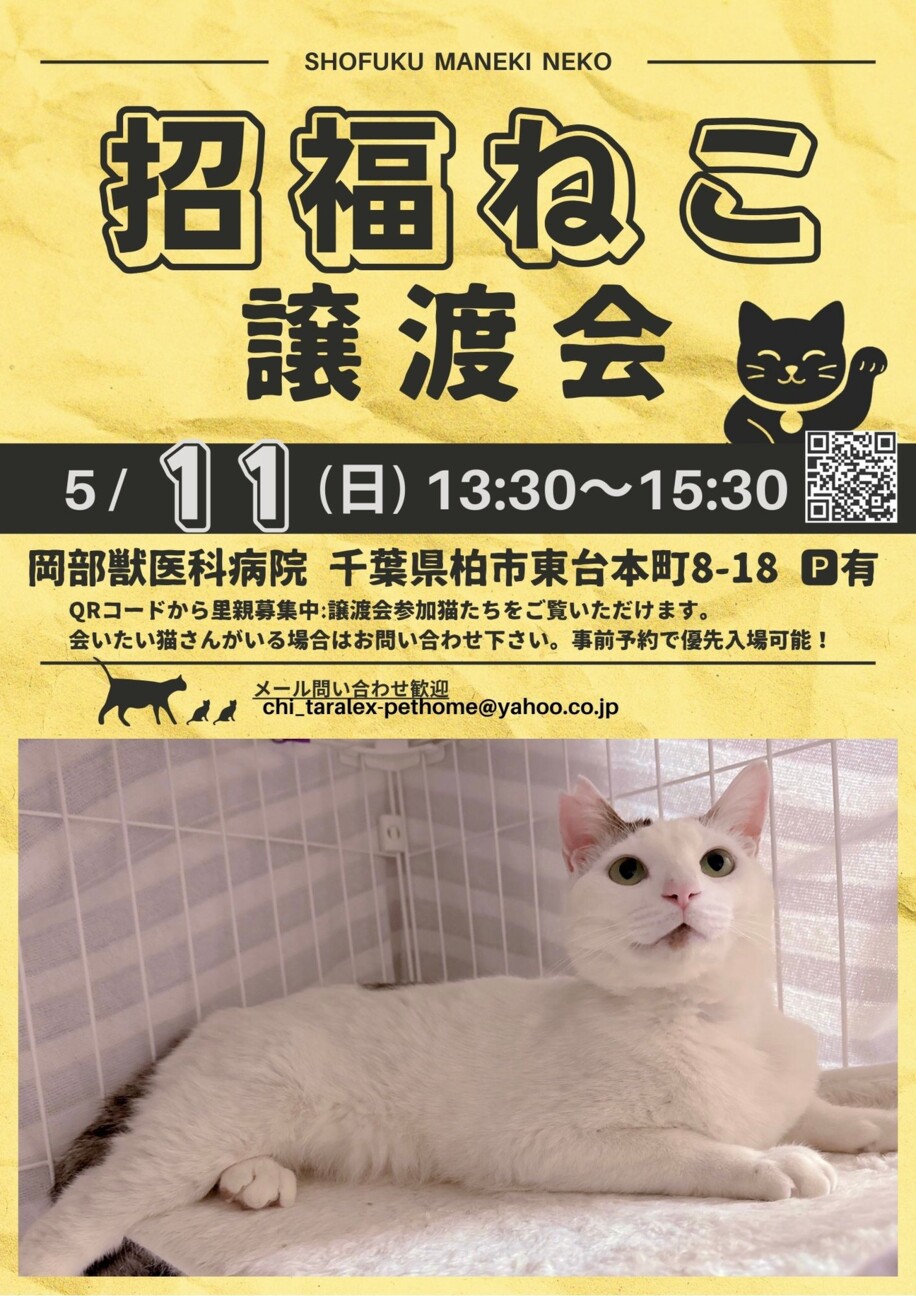 招福ねこ譲渡会:個人ボラが集い開催!7/13(日)13:30〜15:30(最終入場15:15)場所:岡部獣医科病院P有千葉県柏市東台本町8-18駐車スペー...