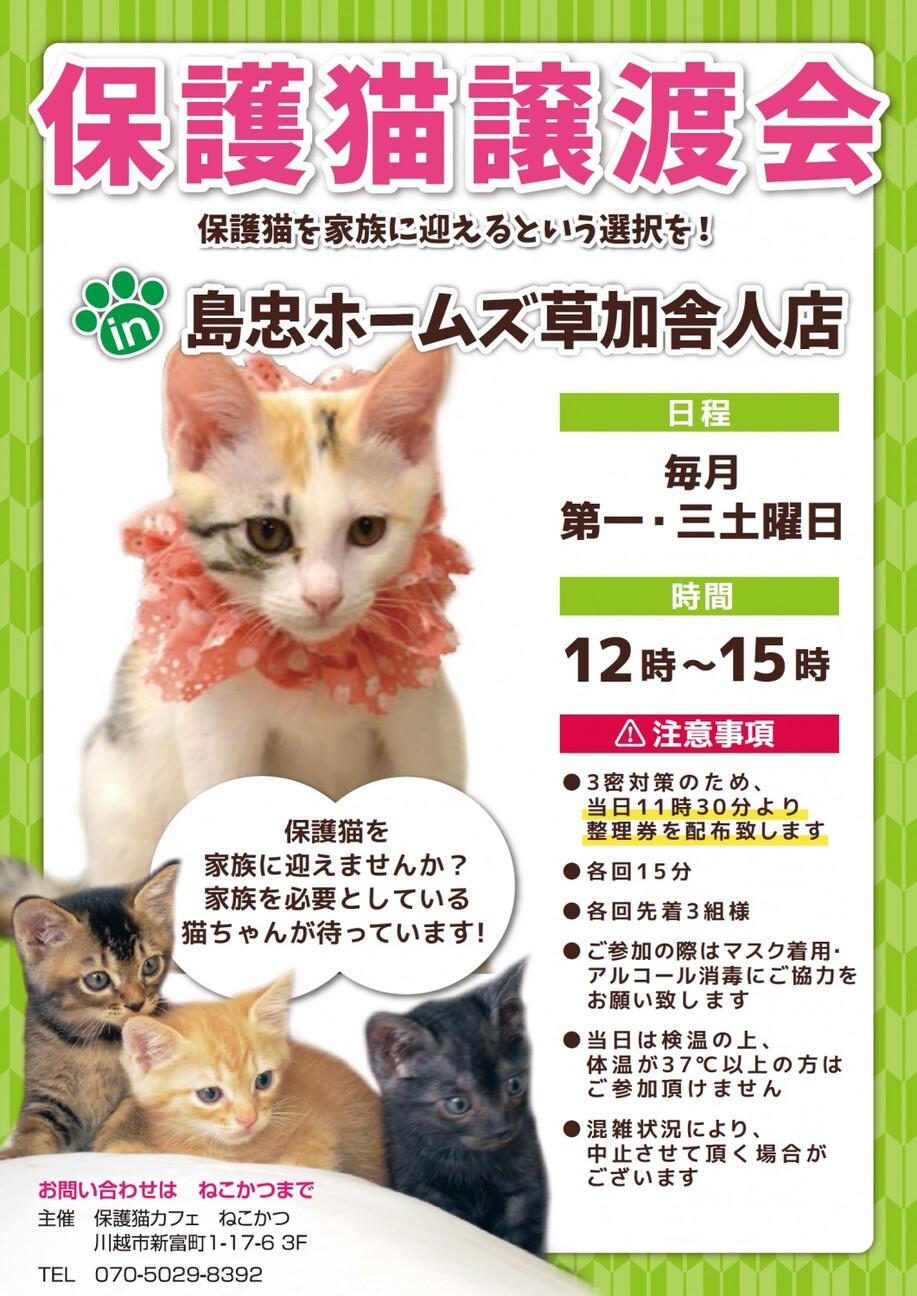 7月5日(土)保護猫カフェ「ねこかつ」さん主催の譲渡会が開催されます。