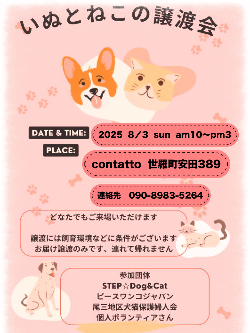 世羅町のドッグカフェandランのcontattoさんにて開催の犬猫譲渡会です!暖かい室内開催で駐車場もバッチリ