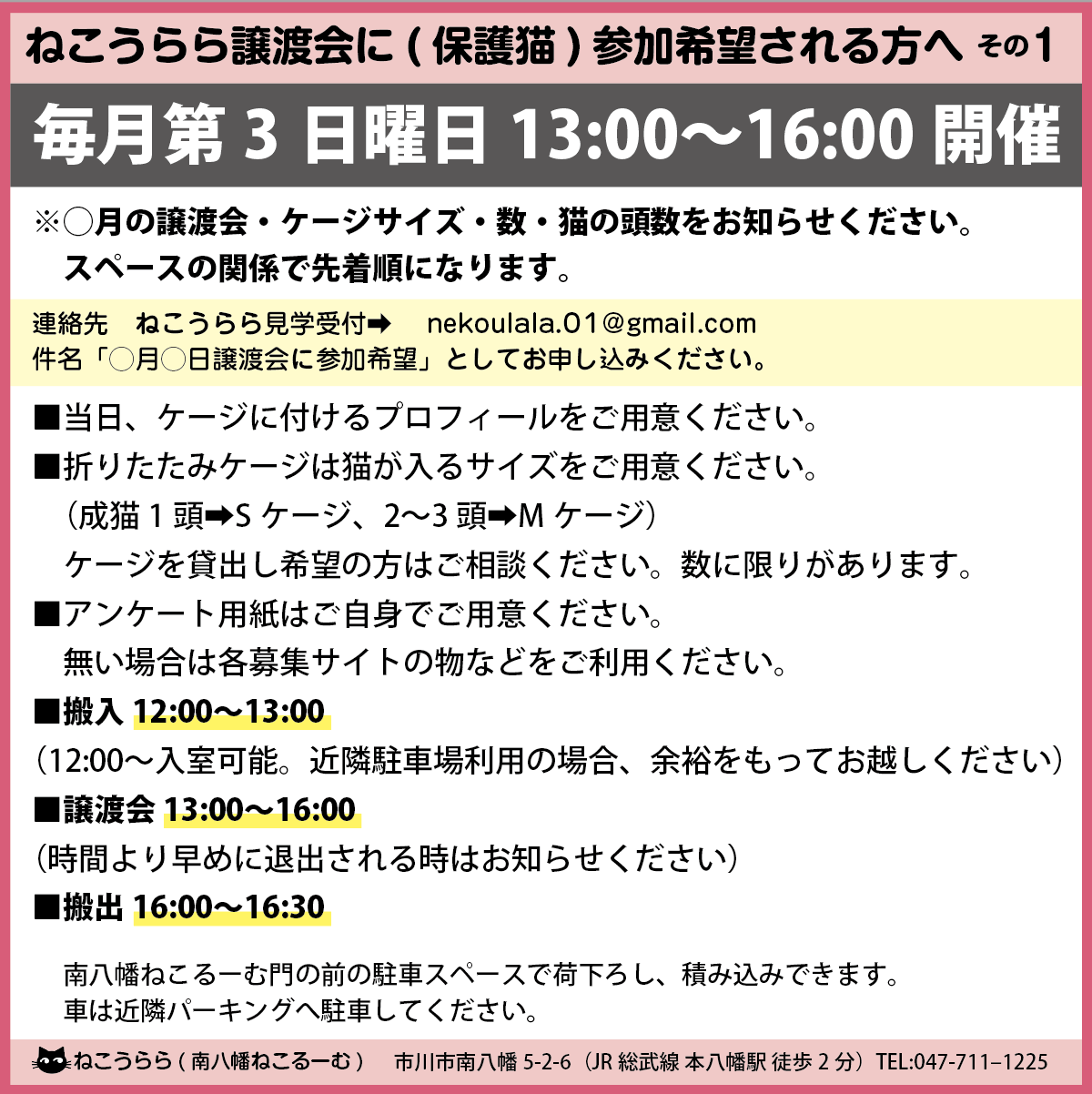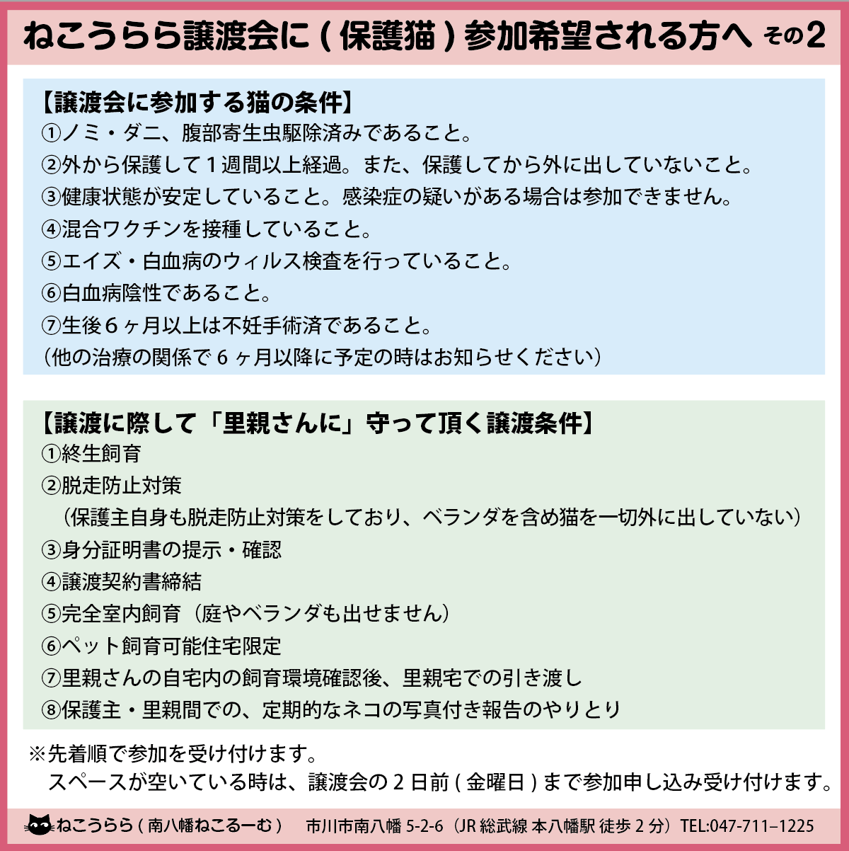 ●保護猫を譲渡会に参加希望される保護主様は、スペースの関係で先着順に受け付けています。折畳みケージの数、頭数をお知らせのうえ、お問い合わせください。
