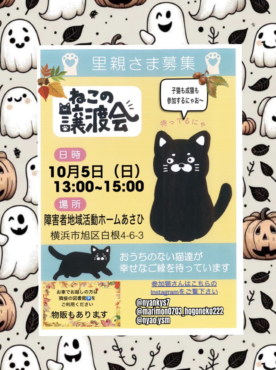 個人ボランティア数人で開催しています仔猫から成猫まで参加予定(当日の体調などで変化あり)予約不要無料駐車場多数あり当日連れて帰る事はできません譲渡には条件...
