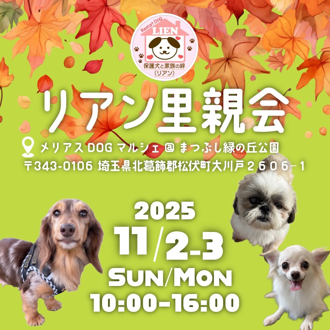 当日開催のメリアスDOGマルシェ内で、保護犬の譲渡会ブースとして参加いたします。参加は無料です。お目当ての子が決まっておりましたら、リアンHPより予めご予...