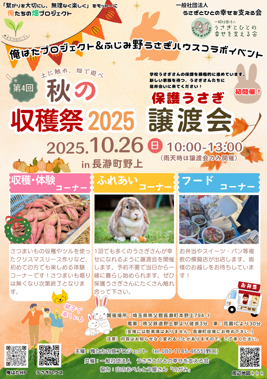 10/26(日)10:00〜13:00 長瀞町の「秋の収穫祭2025」会場にて、ふじみ野うさぎハウスが出張譲渡会を開催します! 今回が長瀞での初開催。行き場を失ったうさぎたちが、新しい家族との出会いを待っています。 譲渡には事前予約やお宅訪問は不要で、当日その場で一緒に暮らし始めることも可能です。 「いつかうさぎを迎えたい」「保護活動に興味がある」そんな方もぜひお気軽にお越しください。 また、収穫体験やフードコーナーなど家族で楽しめる内容も盛りだくさん! 自然の中で、うさぎたちとの優しい時間をお過ごしください