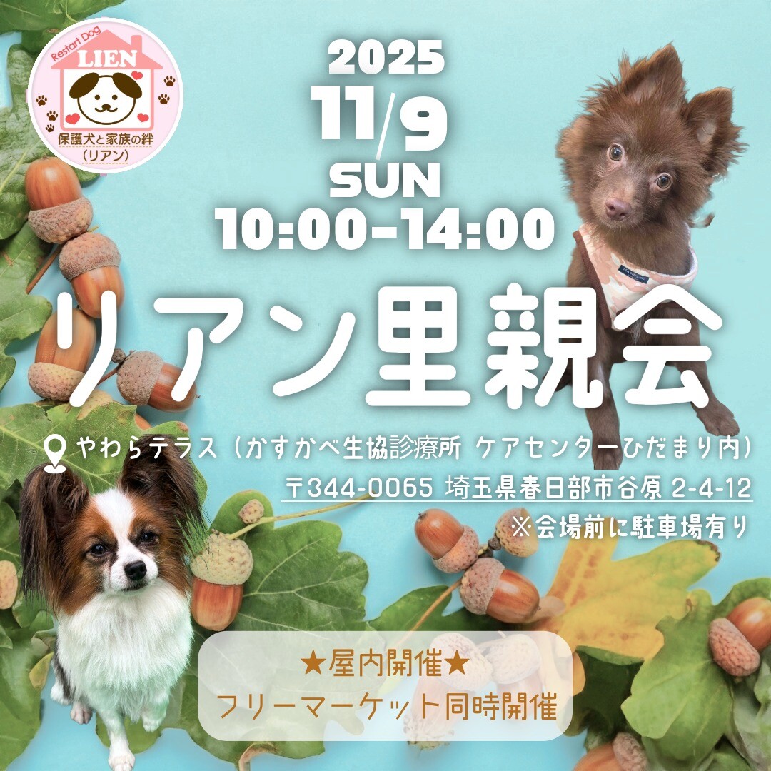 当日開催のメリアスDOGマルシェ内で、保護犬の譲渡会ブースとして参加いたします。参加は無料です。お目当ての子が決まっておりましたら、リアンHPより予めご予...