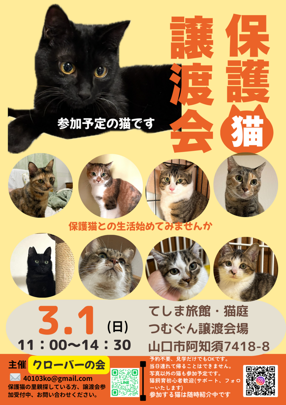 猫ちゃんと触れ合える譲渡会です。猫の温もりに癒されてみませんか。猫飼育始めての方も多くご来場いただいています。出来る限りのフォローサポートさせていただきま...