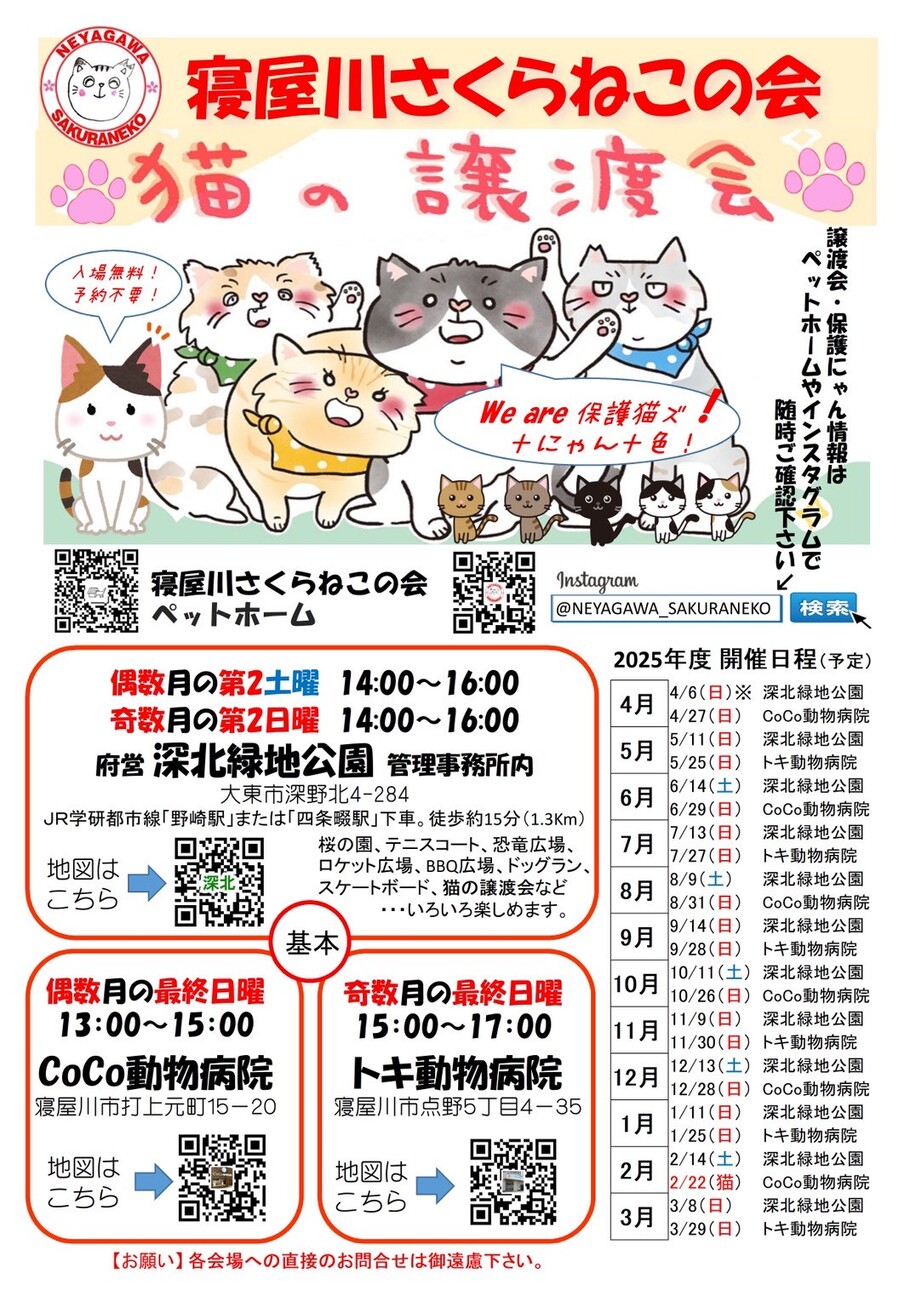 寝屋川さくらねこの会まで、メールまたはDMにてご連絡下さい。