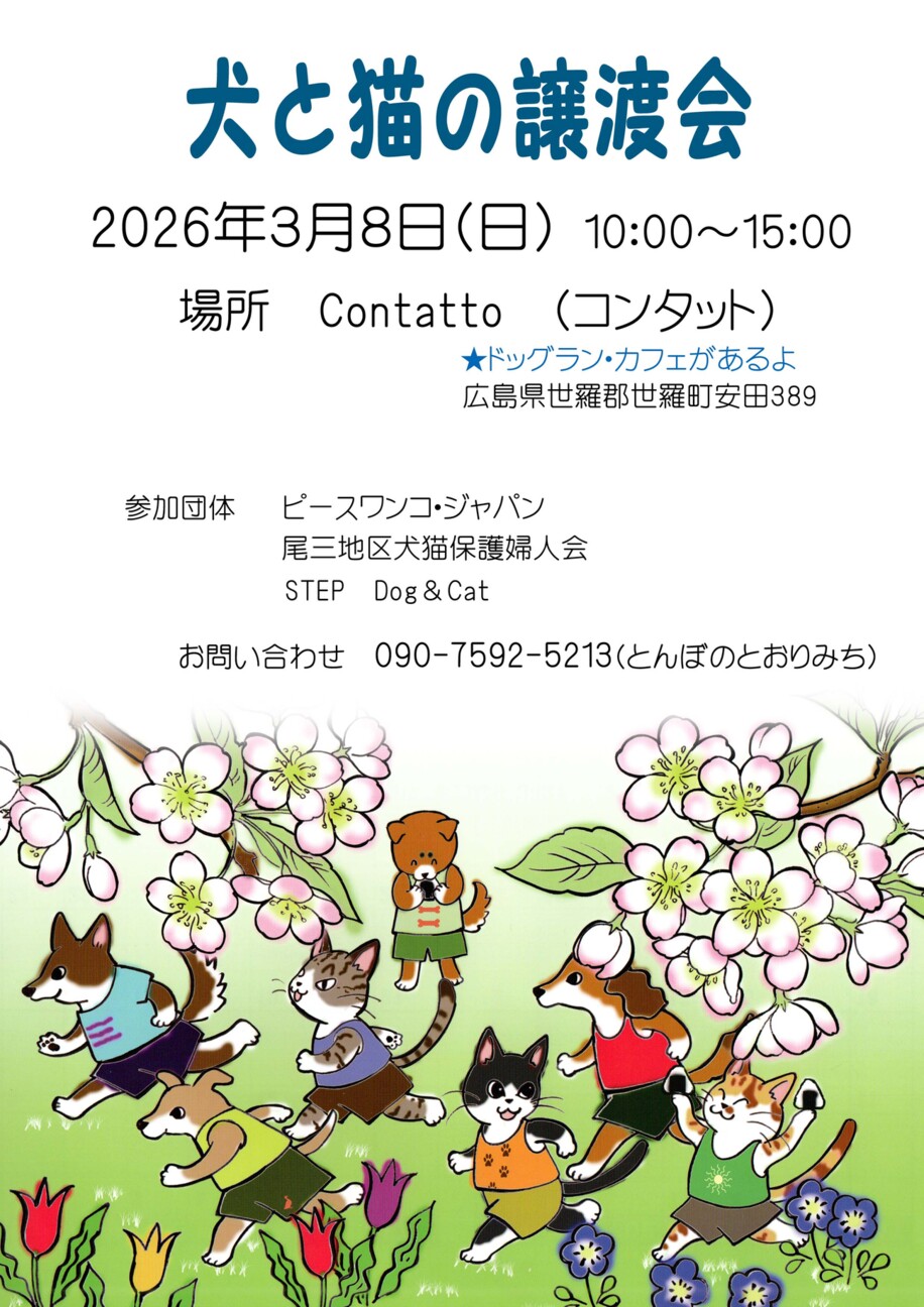 広島県世羅郡世羅町にて、保護された犬と猫の譲渡会を開催します。会場は、犬同伴可のイベントスペースでドッグランもあります。駐車場完備の広々とした会場に、ワク...