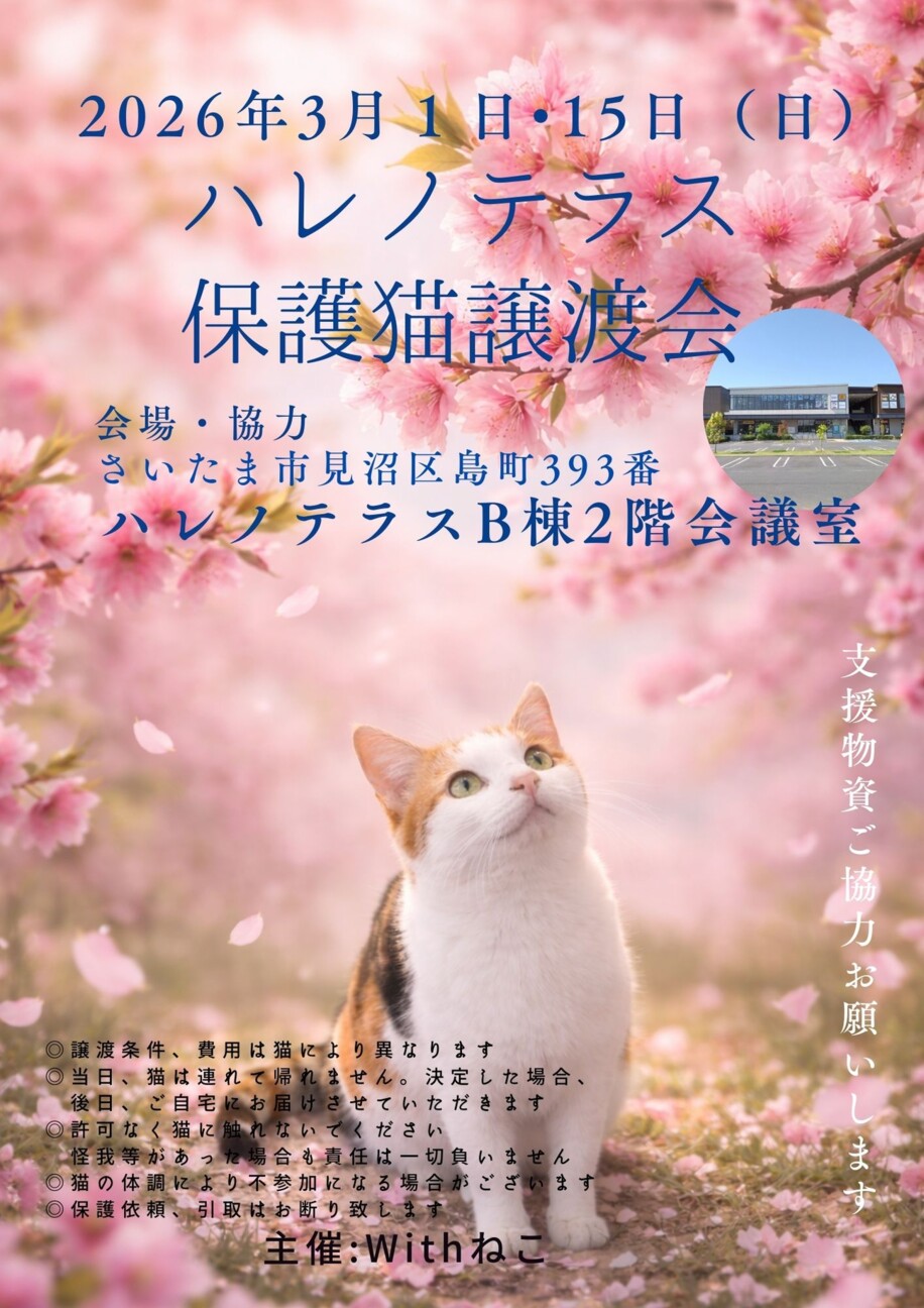 【さいたま市見沼区】3/1(日)ハレノテラス保護猫譲渡会