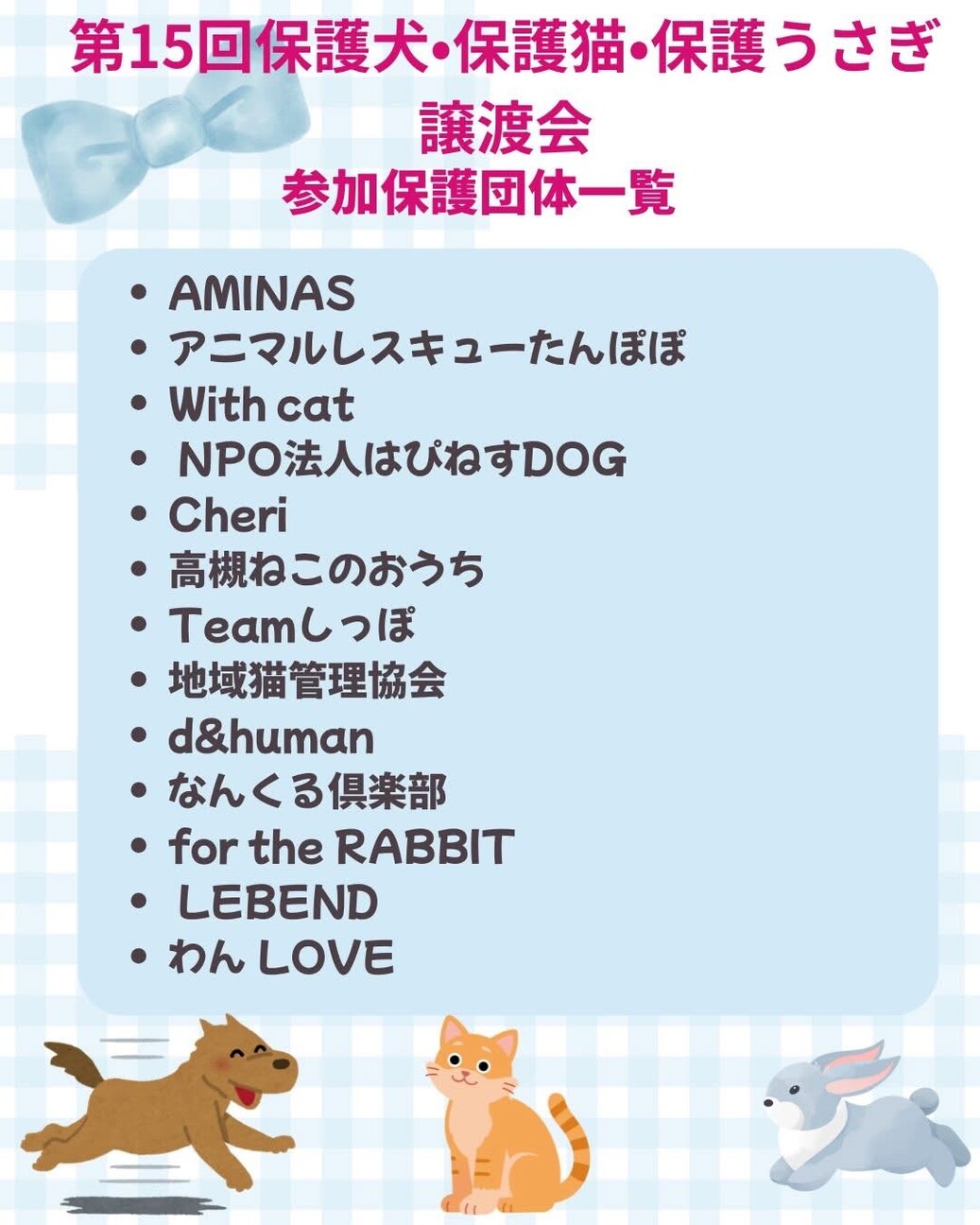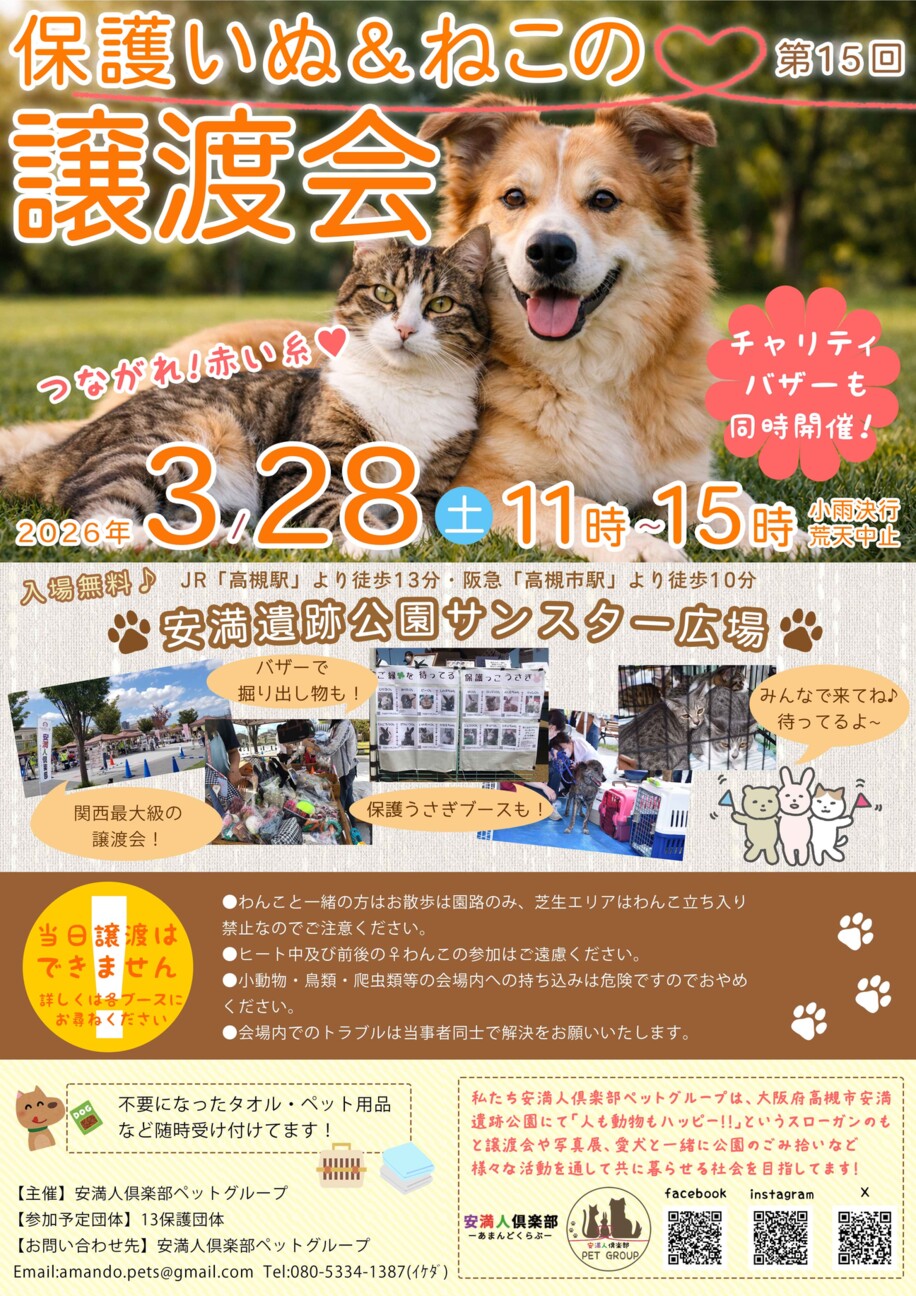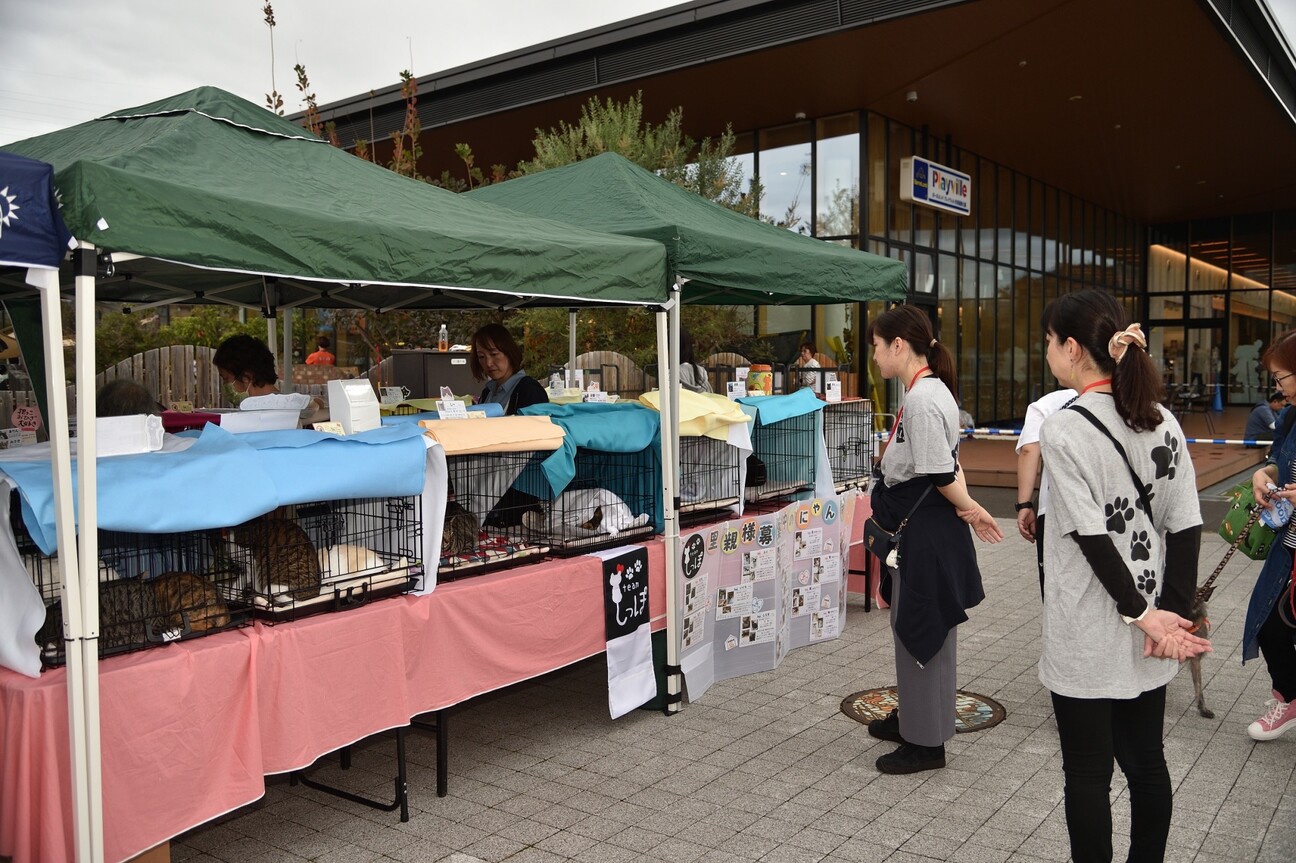 関西最大級の保護団体がやってきます猫4団体うさぎ1(うさぎはパネルのみ)犬8団体合計13団体チャリティーバサーも大盛況です
