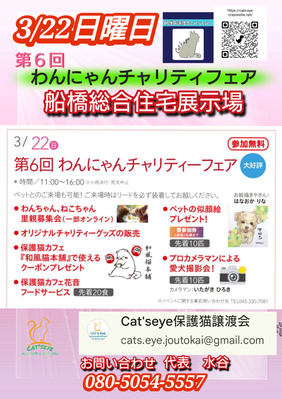 https://cats-eye.crayonsite.net/参加猫ちゃん詳細はホームページよりご確認お願い致します。個人保護猫活動者が集まり保護猫ちゃ...