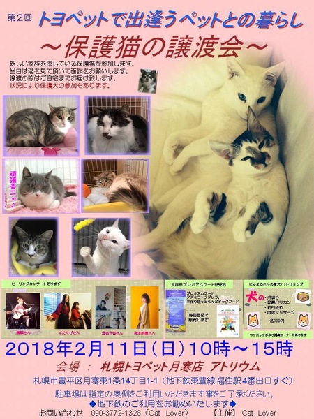 新しい家族を探している保護犬と保護猫が参加しますよ。子猫ちゃんもいます。入場は無料です。ワンちゃんや猫ちゃんに会いに来るだけでも大歓迎!地下鉄東豊線福住駅...
