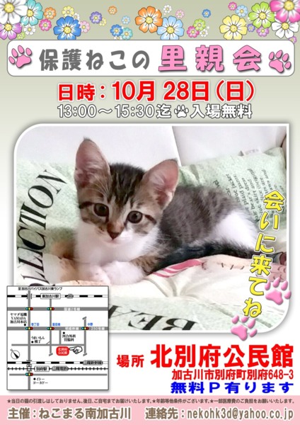 場所北別府公民館〒675-0122加古川市別府町別府643-8無料駐車場完備主催ねこまる南加古川問い合わせnekohk3d@yahoo.co.jp人慣れし...