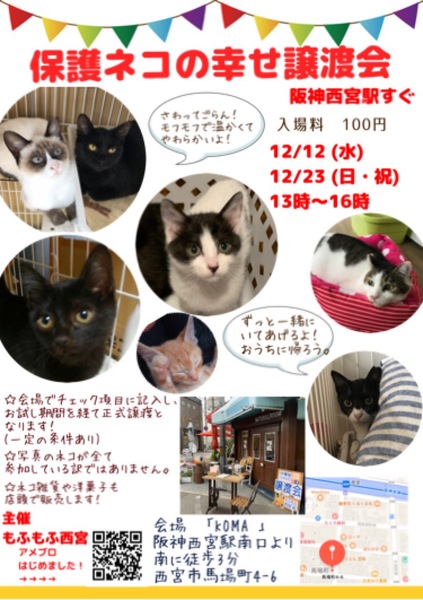 もふもふ西宮です☺︎みんなみんな頑張って命を繋いだ素晴らしい子たちです。ぜひ会いに来てくださいね♡会場の外ではネコ雑貨の物販もあります!売り上げの一部、ま...