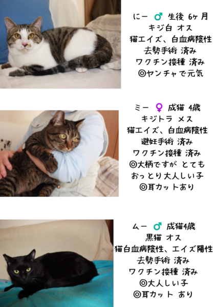 ※参加予定猫は体調不良や譲渡決定などで不参加になる事もあらります。参加猫の情報は私のプロフィールから活動ブログへ入り、譲渡会前日にブログ内にてご確認下さい。