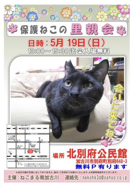 場所北別府公民館〒675-0122加古川市別府町別府643-8無料駐車場完備主催ねこまる南加古川問い合わせnekohk3d@yahoo.co.jp人慣れし...