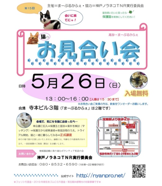 1匹でも多くの保護猫が新しい家族と出会い、ずっと暮らせるようにご縁をつなぐ「猫のお見合い会」の西部拠点・保護猫カフェ「まーぶるかふぇ(Marble CAFE)」(高砂市神爪)で、2018年4月から、毎月定期開催しています。