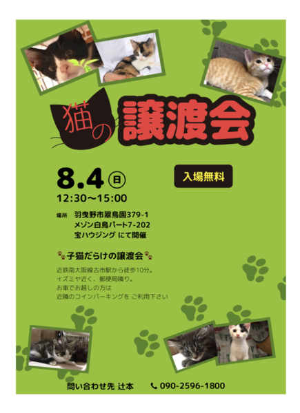 大阪府自粛要請を受け、残念ながら、今回の譲渡会は中止となりました。来年開催予定ですので、よろしくお願いします。
