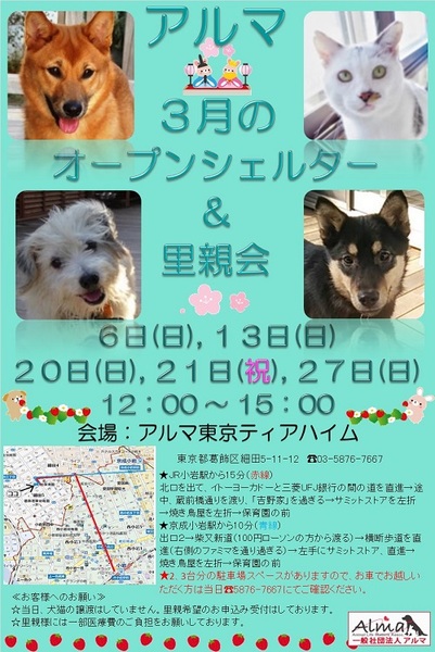 3月13日(日)、ティアハイムオープンシェルター里親会を開催します。
