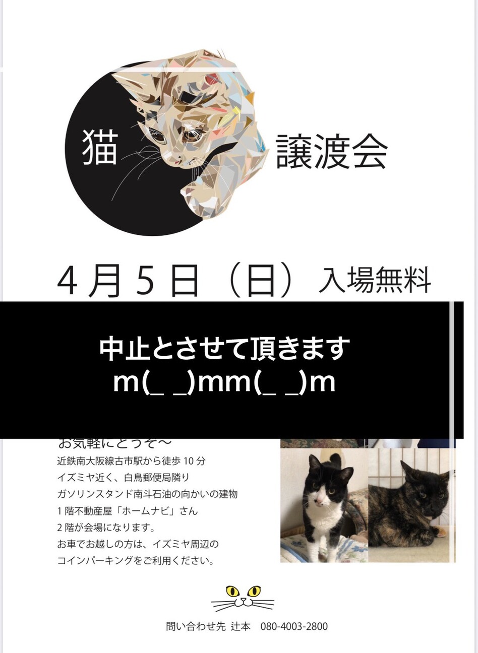 新型コロナウイルスによる自粛要請を受け 残念ながら今回の譲渡会は中止とさせて頂きます。 楽しみにしてくださっていた方々には 大変申し訳なく思います。 会場の外に設置されております掲示板にて、 今回参加予定の猫をパネルで紹介させていただきます。 もし気になる猫がございましたら、ご連絡ください。 連絡先 辻本 080-4003-2800