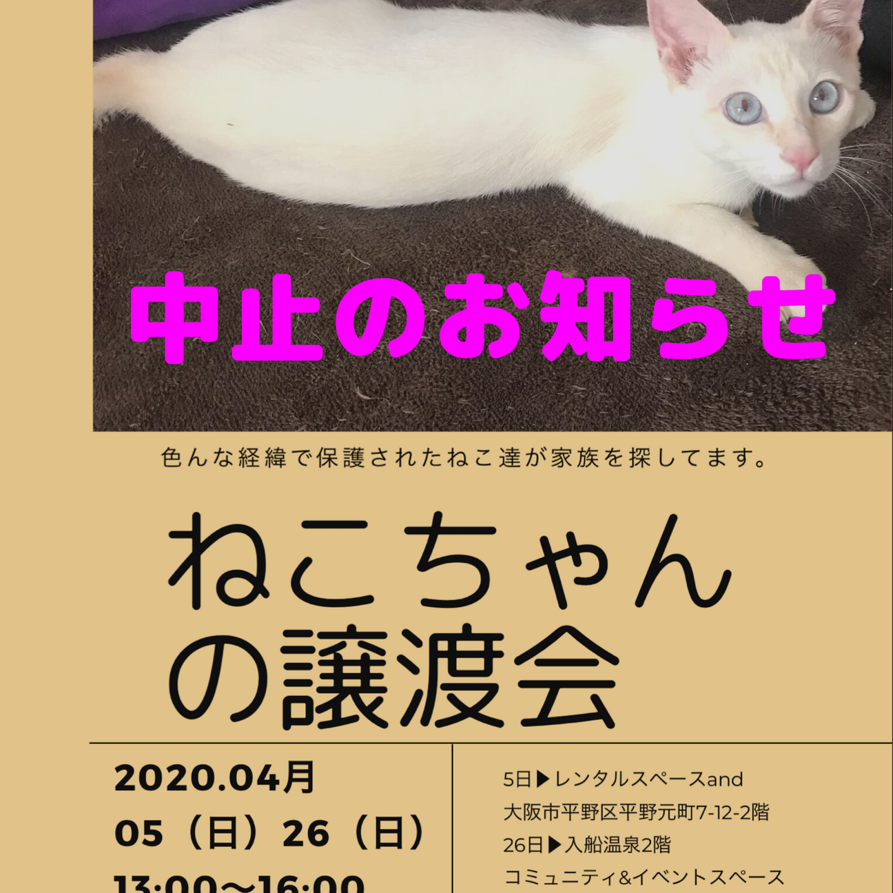 4月26日(日)に開催を予定しておりました「ねこちゃんの譲渡会」は、新型コロナウイルス感染症が拡大している状況を受け、中止することとしましたのでお知らせいたします。