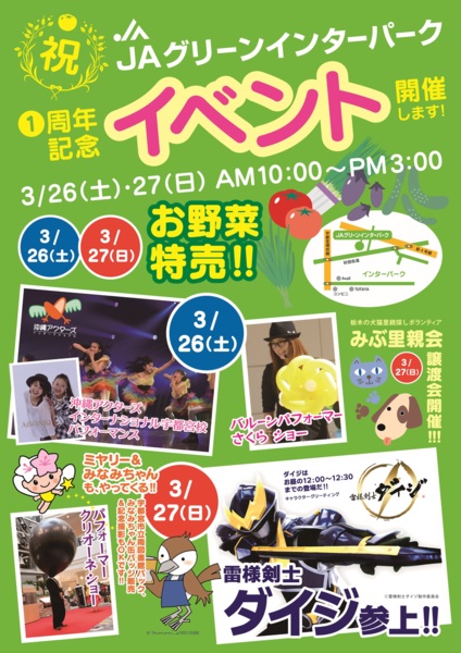 3/27(日)は宇都宮市のJAグリーンインターパーク様のオープン1周年記念イベント内で出張里親会を開催させていただきます。犬(成犬)4頭、猫約10匹が参加予定となっています。