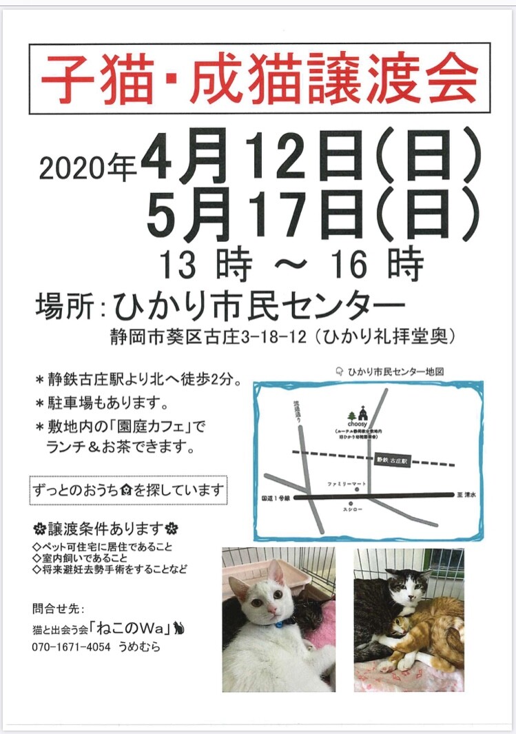 静鉄古庄駅から北へ徒歩2分、ひかり礼拝堂の奥です。駐車場あり。ご来場の皆様には飼育環境等確認のためのアンケートをお願いしています。先に入場時に代表者の方に...