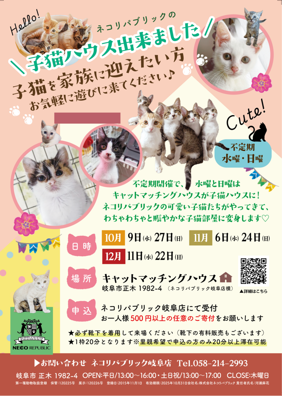 ネコリパブリック岐阜店の南隣に、新たな出会いの場を作るスペースがオープン!その名は…CATMATCHINGHOUSE!「どんな性格の子をお迎えしていいのか...