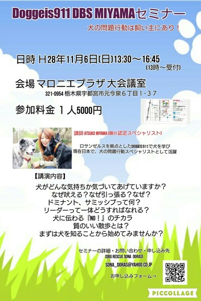 講師 Atsuko Miyama(D911 認定スペシャリスト) ロサンゼルスを拠点としたdoggies911で犬を学び、現在国内で犬の問題行動 スペシャリストとして活躍中 【講演内容】 お座りやフセできても、散歩中や家の中で問題があったりしませんか? なぜ吠える? なぜ吠える? なぜ噛む? などの「なぜ」をわかりやすくお話しし解決へ導きます。 まずは犬を知ることから始めてみませんか。 セミナーの詳細・お問い合わせ・申し込み sona_doras@yahoo.co.jp DOG RESCUE SONA DORAS