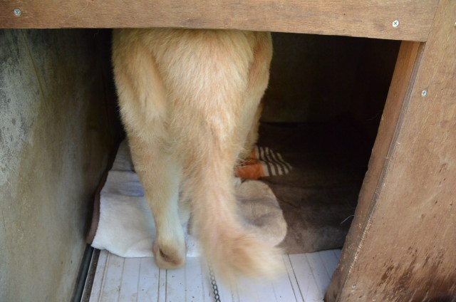 フードや水を持って行った時、入口の近くに寝そべっている大五郎に声をかけると、