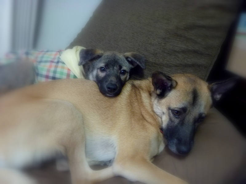 まあ・・驚いたのは、我が家で愛犬Edと一緒にした瞬間、ビビリはどこかへ飛んで行って、いきなり子犬らしさ発揮。Edは男の子(去勢していますけれど?!)ですが、お母さんだと思ったのか、おなかの下に入ってまるでおっぱいを飲むように甘えてみたり、背中に顎を載せて寝てみたり、Edが歩くと横をついて歩き、やることなすことEdのコピーでした。実はEdと鼻黒くろすけ君は出身地が同じ。つまりおそらく同じ野犬の群れの子。血縁です。一緒にいると親子か兄弟のようで本当にほほえましかったです。