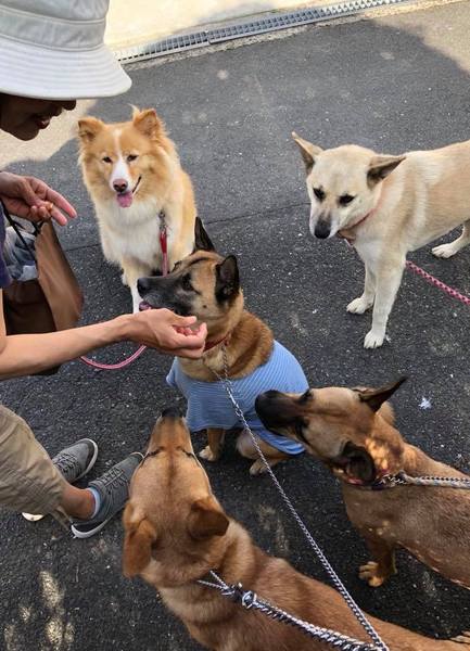 写真中 : Edのお散歩仲間の元野犬たちとのおやつの様子。一番手前がヤマト君