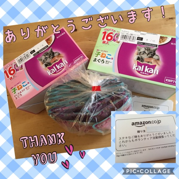 うたちゃん(現・ななちゃん)のママから、こんなにたくさんの子ねこ用フードをご寄付いただきました!! 本当にありがとうございます! うたちゃんを保護してくださったボランティアさまとシェアして、子ねこにあげたいと思います。 ななちゃん、ママとずっと幸せにね(*^^*)