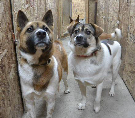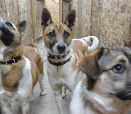 元仔犬犬舎のドッグランから成犬犬舎にけん、かよ、まいがやって来て、今お散歩の練習をしています。 (この日は雨が降っていたので、普段日中は外にいる犬達も犬舎の部屋の中にいました) 立ち耳で2つ首輪をしているのがドッグランのリーダー的存在だった、けん(♂)です。 もう1頭の立ち耳の子がけんの兄弟のかよ(♀)、たれ耳の子がまい(♀) です。全員中型mixです。 こっちの犬舎はまだアウェイなのか、3頭ともキョドリ気味でした(^_^;) お散歩の練習、がんばってネ・・・